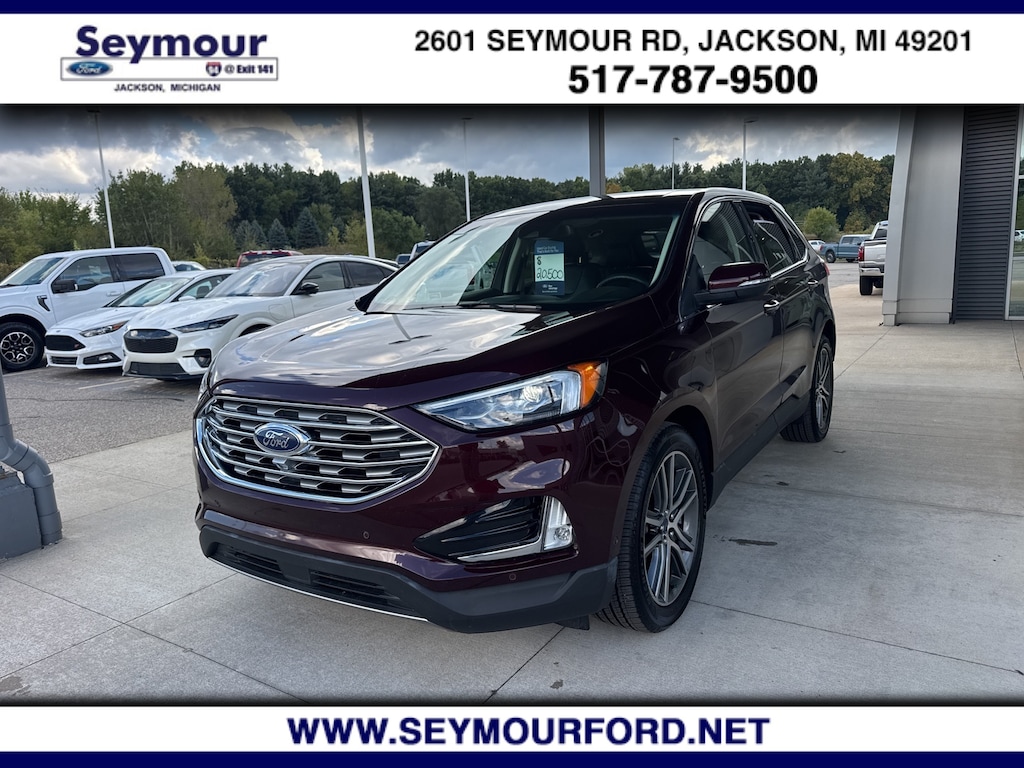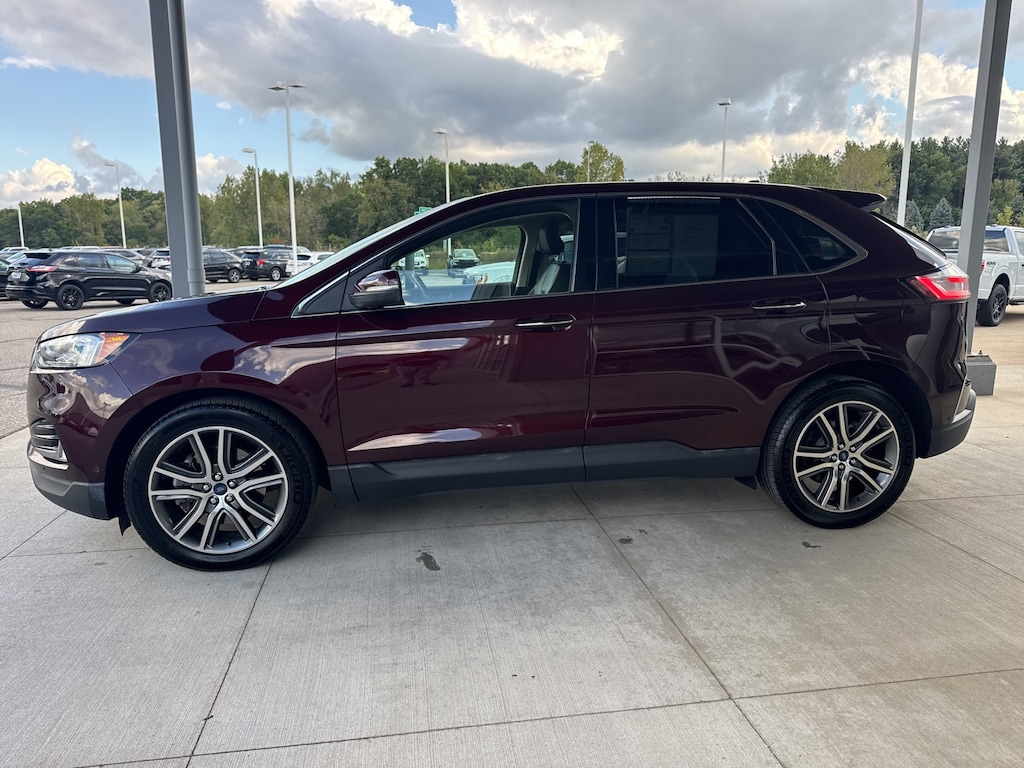 Certified. Burgundy 2019 Ford Edge Titanium AWD 8-Speed Automatic EcoBoost 2.0L I4 GTDi DOHC Turbocharged VCT AWD, Adaptive Cruise Control w/Stop & Go, Adaptive LED Headlamps, Auto-Dimming Driver's Sideview Mirror, Class II Trailer Tow Package, Cold Weather Package, Emergency communication system: SYNC 3 911 Assist, Enhanced Active Park Assist, Equipment Group 301A, Evasive Steering Assist, Front & Rear Floor Liners, Front 180 Degree Camera, Fully automatic headlights, Heated Rear-Seats, Heated Steering Wheel, Leather Trimmed Heated/Cooled Bucket Seats, Panoramic Vista Roof, Power Liftgate, SiriusXM Traffic & Travel Link, SYNC 3 Communications & Entertainment System, Voice-Activated Touchscreen Navigation System, Windshield Wiper De-Icer.